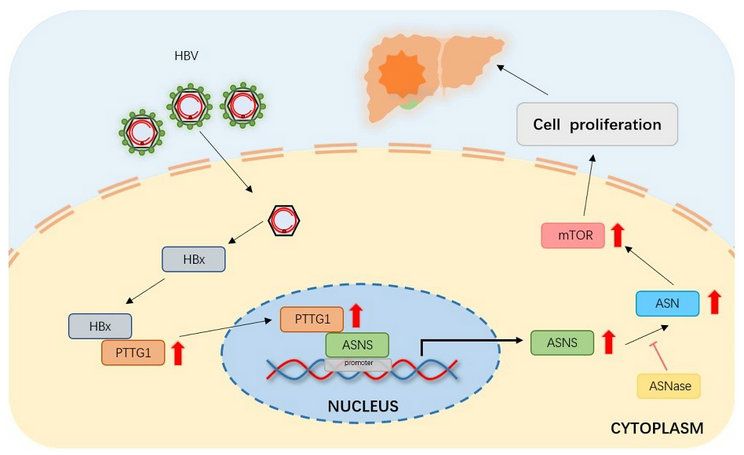 郭云蔚教授团队通过研究发现,PTTG1的高表达是肝细胞癌包括乙肝相关性肝细胞癌发生发展中重要的促进因素之一。HBx通过与PTTG1结合促进PTTG1的表达以及入核,并通过PTTG1发挥致癌作用。PTTG1通过与ASNS启动子区域结合上调ASNS的表达,并进一步上调天冬酰胺代谢,激活mTOR通路,从而促进肝癌细胞增殖及肝癌的进展。