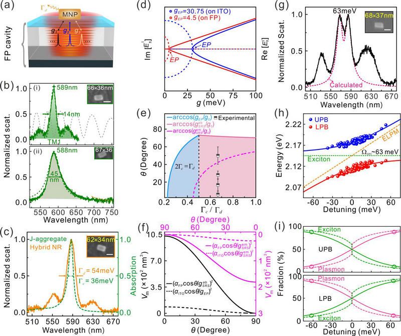 图 1. (a) 介质微腔剪裁金属等离激元模示意图;(b) 单个Au@Ag NR在(i)F-P腔和(ii)ITO衬底上的暗场散射谱;(c) J-aggregate的吸收谱和单个Au@Ag NR在F-P腔的散射谱;(d) 耦合系统在F-P腔和ITO衬底上的奇异点处的临界耦合强度;(e) 在吸收和辐射强耦合临界条件下,所允许激子偶极矩偏离最强电场的最大角度作为激子线宽与等离激元线宽比值的函数;(f) 在吸收和辐射强耦合临界条件下,有腔和无腔设计时所允许的Au@Ag NR最大模体积作为角度的函数;(g) 共振情况下腔剪裁的单个Au@Ag NR@J-aggregate杂化系统的暗场散射测量结果;(h) 实验数据(点图)及理论计算(线图)得到的杂化系统色散关系;(i) 色散关系上支(UPB)与下支(LPB)中的等离激元模式、J-aggregate激子的相对占比。