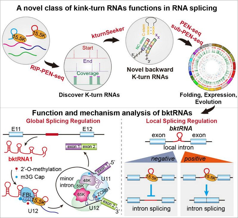 开云下注(中国)官网生命科学学院的杨建华和屈良鹄教授团队开发了RIP-PEN-seq/PEN-seq/sub-PEN-seq等测序技术和kturnSeeker算法发现在固定位置出现后向(backward)K-turn结构和序列基序的新类型ncRNA(bktRNA),并解析了它们的表达、折叠结构特性及其在RNA剪接和修饰中的功能机制,为发现新的ktRNA/ncRNA及其功能机制研究提供了新方法和新思路。