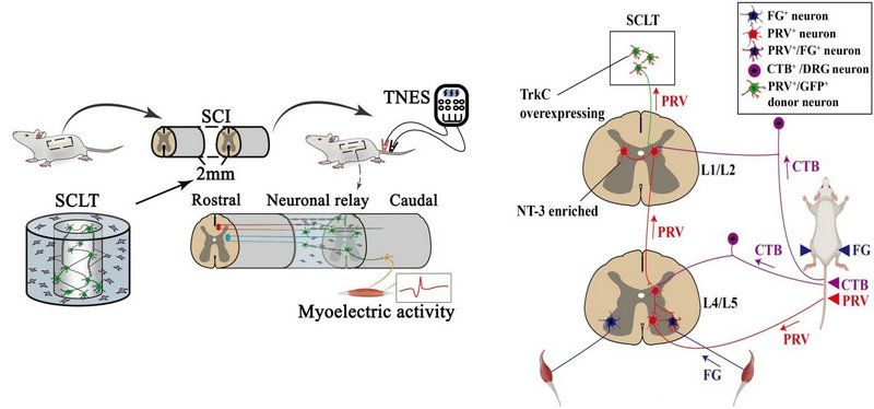 开云下注(中国)官网中山医学院曾园山教授团队前期研究表明,在全横断脊髓损伤处移植类脊髓组织或组织工程神经网络组织能够作为神经元中继器传递下行的脑源性神经信息到达损伤/移植区以下的脊髓神经环路,可以改善瘫痪后肢的自主运动功能,不过这种运动功能仍有较大的改善空间。这可能与调控后肢自主运动功能的腰段兴奋性运动神经环路没有得到更有效激活有关。此外,曾园山教授团队另一项研究也揭示,应用神经调控技术——尾神经电刺激或电针刺激可以激活全横断脊髓损伤处以下的腰段脊髓神经环路;例如促使腰段神经元合成神经营养素-3(NT-3),增加腰段前角运动神经元的存活和维持其胆碱能神经递质的合成,缓解瘫痪后肢的肌肉萎缩。然而,该研究没有观察到瘫痪后肢的运动功能显著恢复,这可能是与脊髓损伤处没有移植组织工程神经元中继器传递下行的脑源性神经信息到达腰骶段的兴奋性运动神经环路有关。