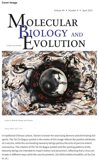 该研究以“Global dynamics of porcine enteric coronavirus PEDV epidemiology, evolution and transmission”为题,近期在分子进化权威期刊MOLECULAR BIOLOGY AND EVOLUTION以封面文章发表。封面以太极八卦和敦煌壁画等中国传统元素作为设计基础,展示了“道高一尺,魔高一丈”,即猪腹泻冠状病毒遗传演化突破传统疫苗免疫屏障的情景。论文首次阐明PEDV基于单倍型算法在世界的分型,并且发现商品化疫苗的使用,可能加快了PEDV的进化速率,分子生物学实验进一步发现了能够识别PEDV不同毒株分型的特异性表位。该研究对理解病原体变异规律、冠状病毒流行病学追踪、预测病毒的演化方向具有重要科学意义。