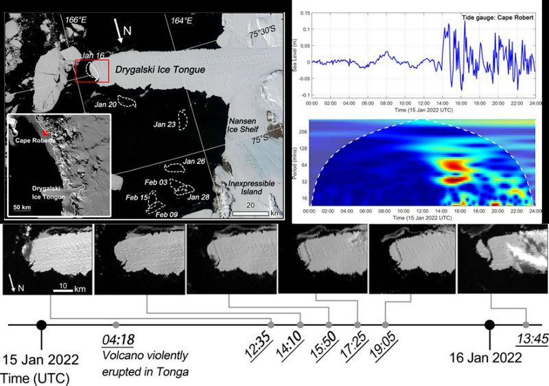 2022年1月15日4时18分(UTC),汤加火山剧烈喷发,同时引发大范围的海啸。距Drygalski冰舌仅180公里的验潮站观测数据表明,海啸约在14时左右到达特拉诺瓦湾区域。遥感卫星影像证实,在海啸到达该区域之前,冰舌前端仍未发生崩解(12时35分);但在海啸到达不到两小时后(15时50分),其前端出现了一条横贯冰舌的裂缝。随后17时25分的遥感影像表明,一块约10千米×4.5千米大小的冰山已经明显的从冰舌前端断裂下来。在接下来的一个多月内,其在洋流和风的共同作用下沿着海岸带不断漂移,直到3月才离开特拉诺瓦湾。