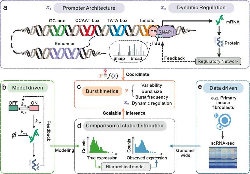 由随机过程引起的基因表达可变性已成为研究基因调控的一个核心关注点。基因通常以不连续的爆发方式随机转录。转录爆发被认为是基因表达随机性的主要代理,并有助于细胞间的变异性,但是调控转录爆发动力学的分子机制仍然难以捉摸。许多实验研究已经为静态启动子结构和序列与转录爆发以及由此导致的基因表达可变性之间的联系提供了证据。这种可变性可以通过复杂的调控网络从mRNA传播到蛋白质,并进一步传播到下游靶基因。这提出了重要的问题:在全基因组范围内,静态启动子调控序列如何编码转录爆发动力学,动态基因调控网络如何形成爆发动力学?