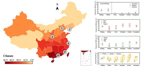 研究团队通过多个城市、不同季节的室内模拟测试,证实了该智能窗户具有室内温度调节能力和建筑节能效果。选取北京、大连、西安、上海、福州和广州作为代表性的试点城市,跨越北纬23°N 到40°N,覆盖了亚热带、温带、沿海、内陆等不同地理和气候特点,从2021年12月到2022年8月,进行了为期九个月的室内模拟测试(图3)。在北方,模拟冬季供暖条件,利用智能窗户的热致变色效应,有效地降低了室内热量的辐射逃逸,表现出优异的建筑节能效果(4.04-4.30 kJ m-3)。在春季,广州的智能窗户可将室内温度降低4.0℃左右,并节能5.14 kJ m-3。在夏季,随着气温进一步升高,智能窗户在所有城市均展现优异的温度调节能力(最高可达7.3℃),其建筑节能效率可达9.51 kJ m-3。