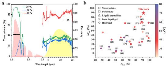 开云下注(中国)官网网讯(通讯员付俊)建筑能耗约占全球能耗的40%,而窗户是建筑内外能量交换的主要通道。利用智能窗户调节建筑能量交换,是实现建筑节能的重要手段。国内外科学家们已经开发了各种智能窗户,如:热致变色型水凝胶智能窗户(Joule, 2019, 3, 290-302),电致变色型钙钛矿智能窗户(Nat. Commun. 2021, 12, 3360),辐射制冷型二氧化钒智能窗户(Science, 2021, 374, 1501-1504)等。研究和开发“全气候”型智能窗户,既能在夏季阻隔过多的阳光直射,又能在冬季降低室内热能的辐射损失,“冬暖夏凉”,不仅有利于显著改善建筑内的舒适性,更有利于节约能源,促进低碳经济发展。然而,大多数智能窗户仍受制于需要供能、工作温度适用范围窄、光调节能力不足等问题。因此,研究可自发调节并适应复杂多变气候的智能窗户具有重要的科学意义和应用价值。