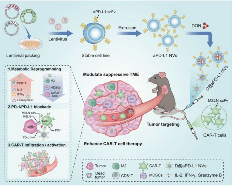 D@aPD-L1 NVs增强CAR-T细胞在实体瘤中治疗效果的示意图