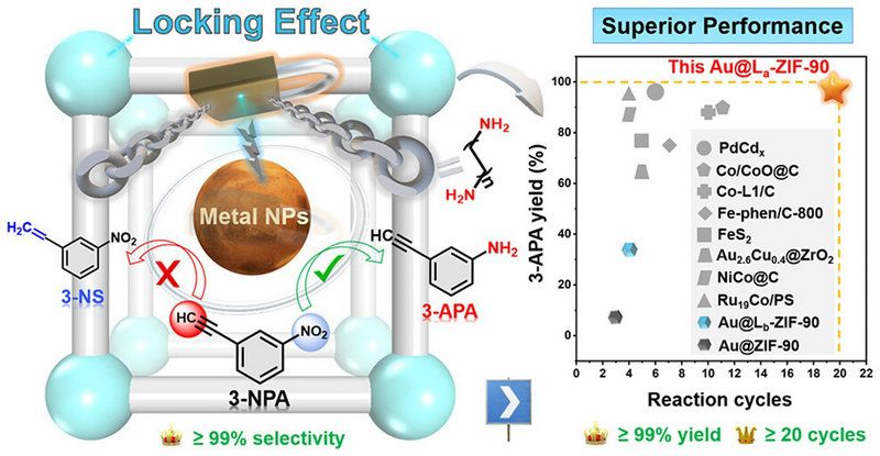 近期,该课题组提出“锁效应”策略,通过醛胺缩合反应先“锁住”MOF载体,再吸附金属盐并进行原位高载量(22 wt.%)还原得到超小金颗粒(2.60nm±0.81nm)。而“锁效应”能有效限制金属颗粒的变大和团聚,并大幅提高催化稳定性(≥20次循环);同时,“锁效应”给金属颗粒带来的电荷调控能够进一步反转催化底物的热力学能垒,从而高产率、高稳定性地选择性加氢制备氨基苯乙炔(≥99%产率);这种策略还具有良好的金属普适性(Ag、Co、Cu)和MOF普适性(UiO-MOF体系等),为Metal@MOF催化剂的工业应用提供了新思路。