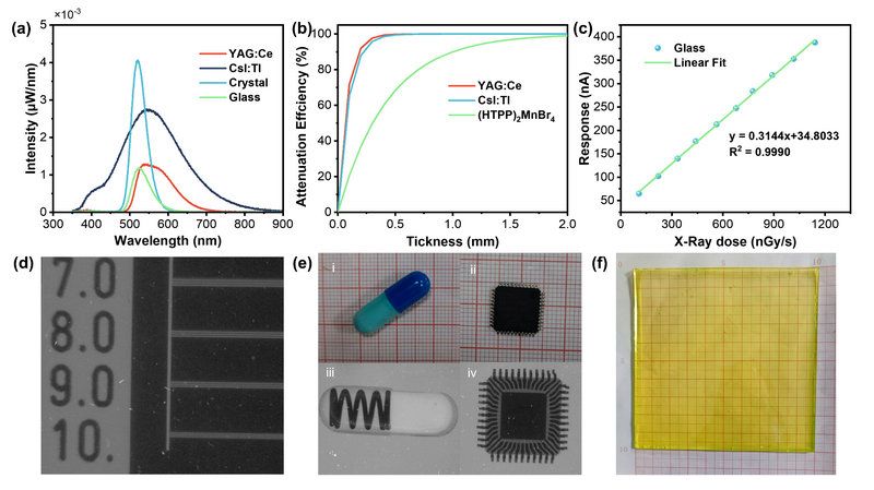 图2. 玻璃态 (HTPP)2MnBr4的闪烁性能以及X射线成像性能