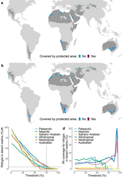 图3 当全球平均气温相比工业化前升高2°C时,荒漠鸟类的气候避难所及其保护现状。小图a展示的气候避难所是每个荒漠区系内气候变化对鸟类影响处于最低25%且鸟类多样性处于最高25%的地区。小图b展示的气候避难所在每个荒漠区系中均占总面积的5%,根据气候变化影响和鸟类多样性选取避难所时采用的统一百分位阈值则根据这一要求在荒漠区系间浮动。小图c展示了统一百分位阈值与每个荒漠区系中被选定为避难所的区域面积百分比之间的关系。小图d展示了百分位阈值与每个荒漠区系中被选定为避难所的区域被保护区覆盖的比例之间的关系。