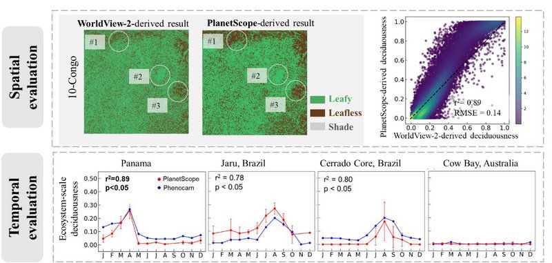 该研究在具有大降水梯度(1,470-2,819 毫米每年)的 16 个热带森林地点(图1)测试了该方法的有效性。在这些站点中分别使用超高分辨率卫星 WorldView-2(n=9 个站点)和地面物候相机 phenocams(n=9 个站点)对微小卫星(PlanetScope)获取的落叶度进行了精度评估。