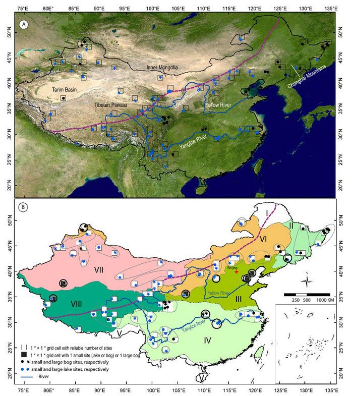 图1:研究区及钻孔孢粉样点:粉色虚线代表现代季风界限,(a)卫星影像图;(b) 中国植被区划 (侯学煜,2019) 罗马数字代表植被区 (I) 寒温带针叶林, (II)温带针阔混交林, (III)暖温带落叶阔叶林, (IV) 亚热带常绿阔叶林 (V) 热带季雨林、雨林 (VI) 温带草原 (VII) 温带荒漠 (VIII) 青藏高原高寒植被。