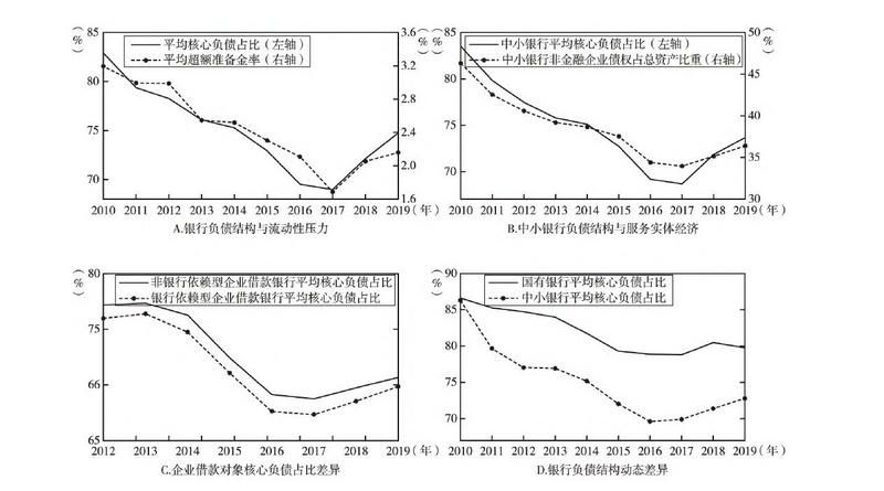 由于银行持有信贷类资产需要长期稳定的流动性支持,相较其他短期债务,存款具有更低的成本和挤兑风险,因而存款和贷款活动具有极强的协同性。同时信贷市场上昂贵的借款对象转换成本也促使中小企业更加倾向于从流动性充足稳定的银行借款。然而近年来迅速发展的影子银行活动极大挤压了存款市场,银行系统尤其是中小银行的负债结构日渐扭曲。2010-2019年银行系统平均核心负债占比由86.30%下降至74.79%,与之相对应的是银行业面临的流动性压力与日俱增,以及银行信贷供给的下降。同时大小银行间非对称的负债结构恶化迫使中小企业调整借款对象,银企信贷匹配结构逐渐扭曲,最终形成银行与企业之间“捆绑的融资困境”。