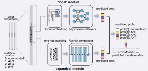 MuRaL以相对较少的点突变数据及大范围的上下游序列来训练模型,基于训练好的模型可预测全基因组每个碱基的点突变概率。MuRaL模型框架由“local”和“expanded”两个模块构成(图1),分别用于学习所关注位点的近端和远端侧翼序列的突变相关信息。其中,近端序列约为上下游10 bp,而远端序列则包括上下游1 Kb或更大的长度。MuRaL通过不同的神经网络模块分别对这两方面信息进行学习,然后汇总两个模块的输出得到最终的预测结果。