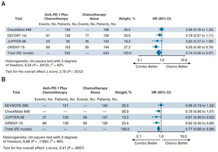 由于不同研究在纳入人群、PD-L1检测方法及化疗方案等方面存在异质性,为进一步探索PD-1单抗联合化疗能否为PD-L1低表达食管鳞癌患者带来真正临床获益,本研究综合目前国际上探究PD-1单抗联合化疗一线治疗晚期食管鳞癌的五项大型III期临床试验,即KEYNOTE-590、CheckMate 648、ESCORT-1st、JUPITER-06以及ORIENT-15研究的数据,进行了荟萃分析(meta-analysis)。结果表明,无论是基于肿瘤细胞阳性比例分数还是联合阳性分数进行划分,无论是在有效率(ORR)、无进展生存时间(PFS)还是总生存时间(OS)上,PD-L1低表达的食管鳞癌患者(TPS<1%或CPS<10)接受PD-1单抗联合化疗相较于单纯化疗同样均能带来更为显著的临床获益。