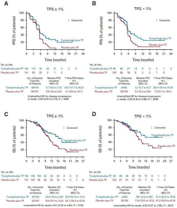 JUPITER-06基于肿瘤细胞阳性比例分数亚组分析的无进展生存时间(A、B)及总生存时间(C、D)结果