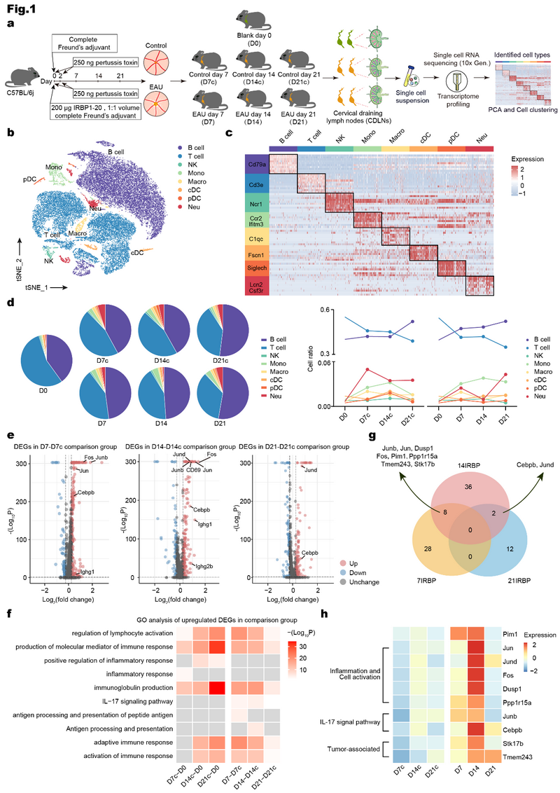 各种免疫细胞的异常是葡萄膜炎中自身免疫破坏的关键因素。其中,Th17细胞主导EAU发病机制。自身反应性Th17细胞的转移可在幼稚小鼠中诱导EAU。此外,越来越多的证据支持B细胞在EAU中的疾病促进作用。然而,缺乏对CD4+T细胞和B细胞的调节以及与葡萄膜炎进展相关的变化的清晰描述。淋巴结(LN)对自身免疫过程至关重要。作为各种免疫细胞,特别是T细胞、B细胞和树突状细胞(DC)之间相互作用的部位,LNs促进抗原呈递、免疫细胞激活和自身免疫反应启动。颈部引流淋巴结(CDLN)是促进大分子和免疫细胞从中枢神经系统有效引流的主要淋巴结。