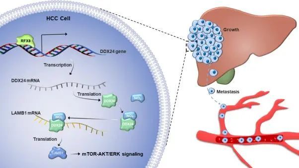 该研究首选通过分析数据库(TCGA)发现DDX24在肝癌中高表达,且DDX24高表达的患者生存预后较差。机制方面,该课题组首次鉴定出DDX24的转录因子RFX8,并进一步证明RFX8可转录上调DDX24的表达。DDX24则通过与NCL作用并进一步通过下游靶点蛋白LAMB1促进肝癌的转移。因此,本研究认为肝癌组织的DDX24表达量可以作为肝癌转移的潜在预测指标,以DDX24为靶点开发相关药物,可能为晚期转移性肝癌患者带来福音。