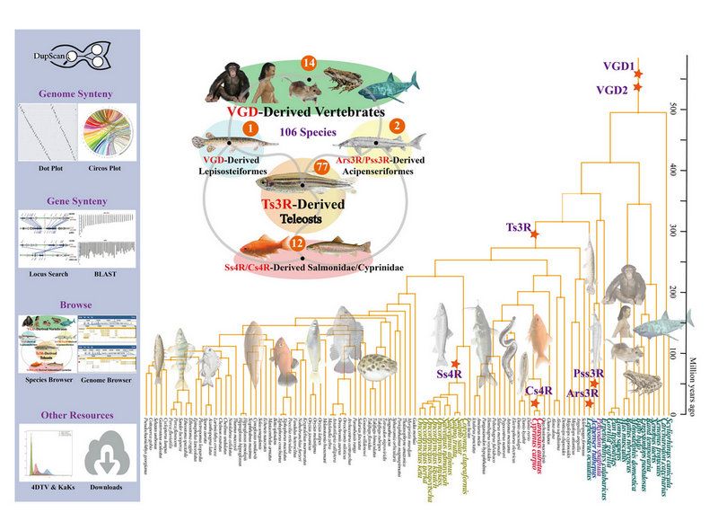 最近,开云下注(中国)官网海洋科学学院卢建国副教授研究团队成功构建了基因-基因组共线性和WGD研究DupScan数据库和一站式分析平台(https://dupscan.sysumeg.com/)。该数据库通过整合106个染色体高质量基因组,实现了基因和基因组尺度的共线性区域的可视化分析。此外,DupScan还搭载了全基因组浏览器和BLAST功能基因染色体定位,支持包括VGD2(Vertebrate Genome Duplication2)、Ars3R(Acipenser ruthenus specific 3R)、Pss3R(Polyodon-spathula specific 3R)、Ts3R(Teleost specific 3R)、Ss4R(Salmon specific 4R)以及Cs4R(Comon carp specific 4R)等共5类WGD事件分析。用户可以使用该平台实现106种全基因组序列的共线性和WGD模式在线分析和预测,为60,000多种世界脊椎动物基因组复制格局提供了高效的在线分析工具(图2)。
