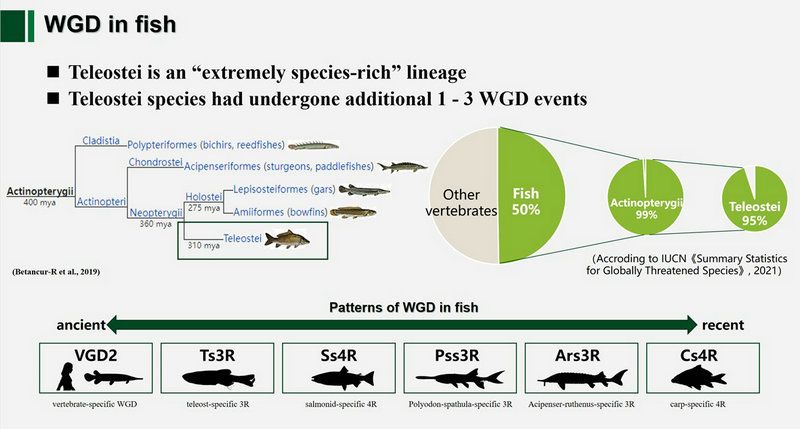 开云下注(中国)官网网讯(通讯员卢建国)脊椎动物进化中的基因复制事件普遍存在,它们在获得新基因和新性状方面发挥着重要作用。而全基因组复制(WGD)可以通过增加基因组的灵活性和复杂性为自然选择提供重要原料,是基因复制的重要来源之一。此外,WGD也是脊椎动物进化的驱动力,对物种,特别是具有复杂WGD模式的鱼类物种多样性有很大贡献(图1)。