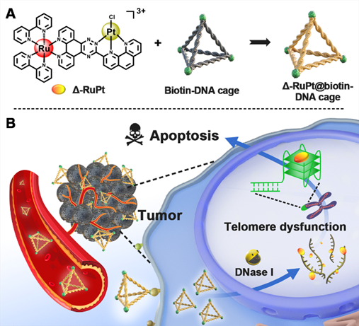 近日,课题组设计合成了铂配合物(Pt)、手性钌配合物(Δ-Ru,Λ-Ru)以及手性钌-铂双核配合物(Δ-RuPt,Λ-RuPt)。该系列配合物对人端粒DNA序列具有高选择性,在非生理的稀溶液条件中均可高效诱导并稳定端粒G–四链体;但在分子拥挤条件下,仅有双核配合物Δ-RuPt和Λ-RuPt保留稳定端粒G–四链体能力。分子对接模拟证明分子拥挤条件下,Δ-RuPt和Λ-RuPt通过静电作用与端粒G–四链体结合。利用生物素标记的DNA Cage负载Δ-RuPt和Λ-RuPt,实现肿瘤细胞靶向性及细胞核富集。经过2天1次尾部静脉注射给药,连续16天的治疗后,Δ-RuPt@biotin-DNA cage和Λ-RuPt@biotin-DNA cage在裸鼠耐药肿瘤模型中表现出了非常良好的抗肿瘤活性。
