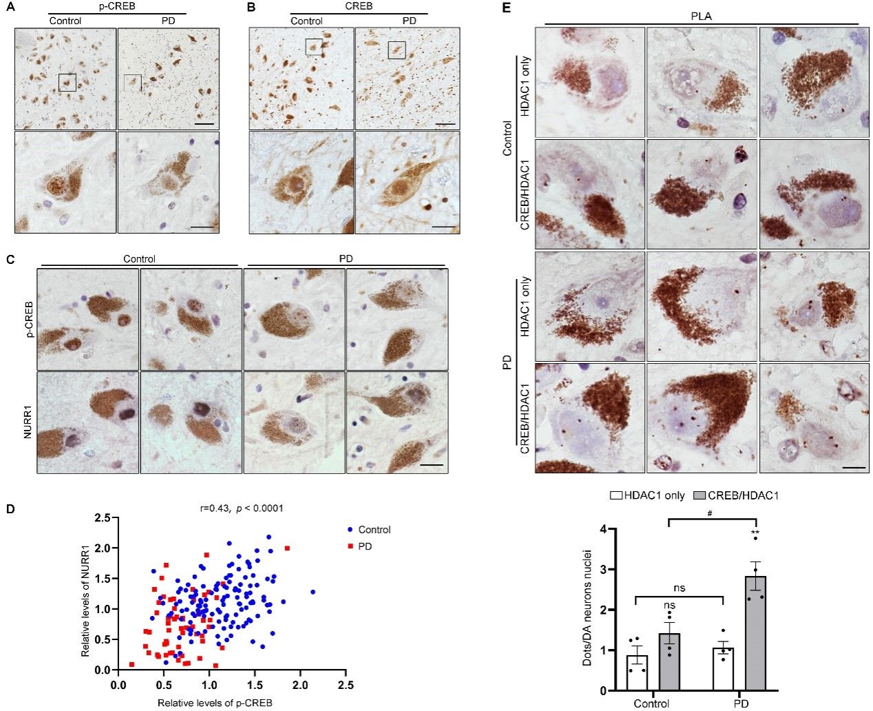 图注:PD患者尸检脑组织中黑质多巴胺神经元CREB去磷酸化失活(A-D)及CREB/HDAC1结合增多(E)