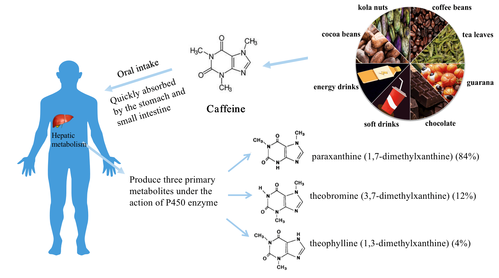 图1. 咖啡因的来源及其主要代谢物的化学结构