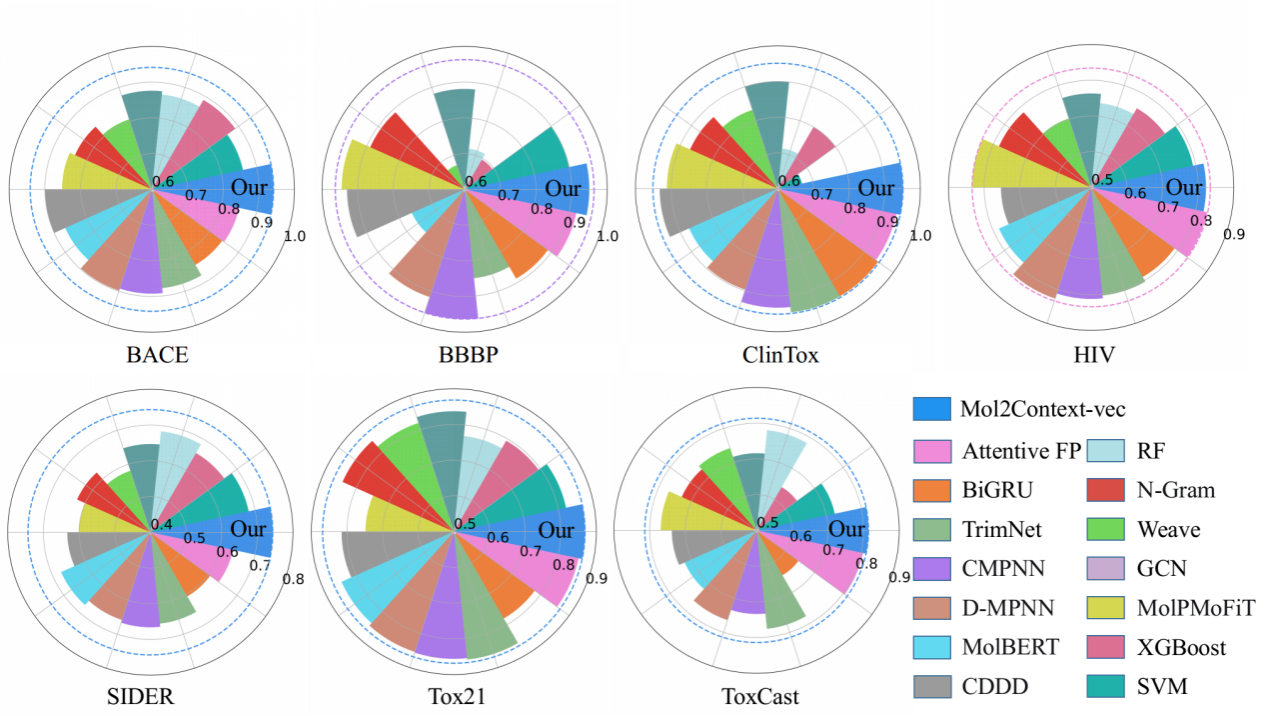 图2. Mol2Context-vec和14种基线方法在生物活性和生理相关的基准数据集上的预测性能对比