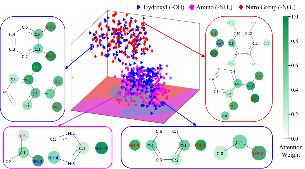 图4. 三个子结构的高维上下文向量嵌入到3D空间中的分布可视化并显示了其中八个分子的注意力权重