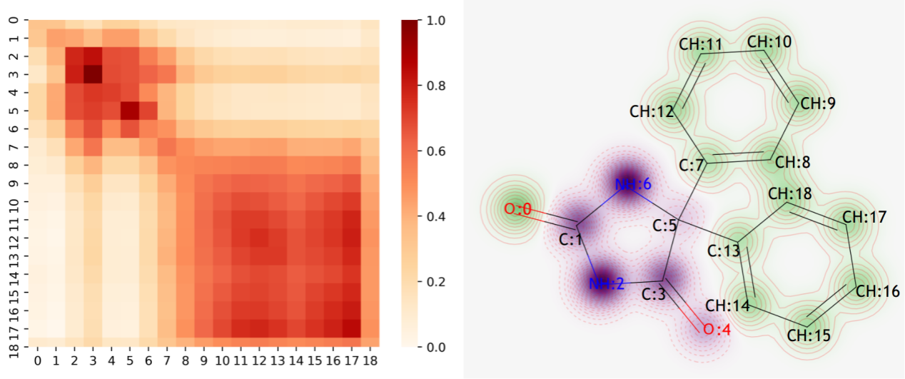 (a) 苯妥英原子相似度矩阵的热图 (b) 苯妥英分子结构中每个原子对溶解度的贡献可视化