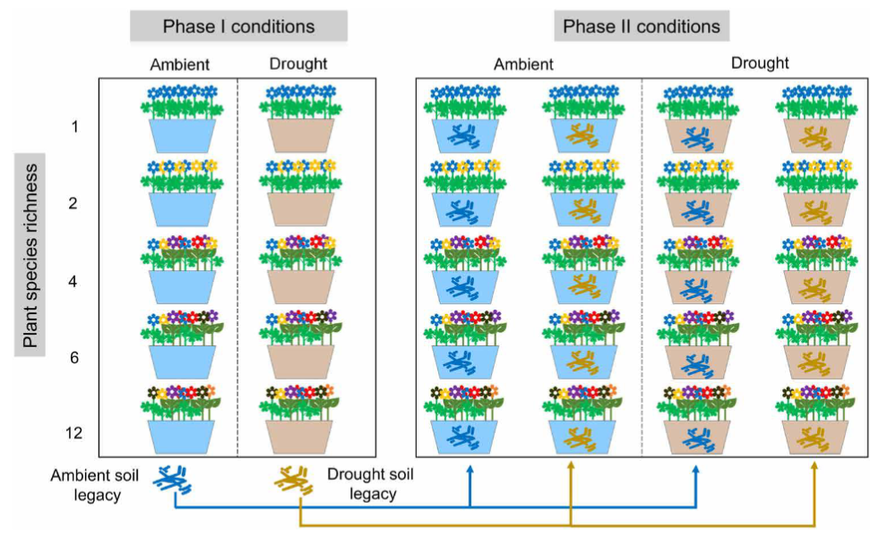 开云下注(中国)官网有害生物控制与资源利用国家重点实验室储诚进教授团队设计了模拟干旱和模式弃耕田群落(360个中型实验生态系/植物群落)的两阶段实验,以研究在随后的干旱下,降雨的慢性减少(压力干旱)是否以及如何改变土壤遗留效应和植物多样性-生产力关系。在第一阶段,在环境或干旱条件下,在均质土壤中种植了120个具有五个物种丰富度水平的模式植物群落,以生成“条件”土壤样本。在第二阶段,为新建立的植物群落提供了土壤接种物,无论是否有之前的干旱暴露,并经受干旱或环境浇水条件(图1)。具体而言,研究假设(i)干旱和植物物种丰富度共同影响土壤微生物群落,(ii)干旱土壤遗留效应影响生物多样性效应对植物生产力的影响,以及(iii)随后的干旱改变了干旱土壤遗留效应对多样性-生产力关系的影响。