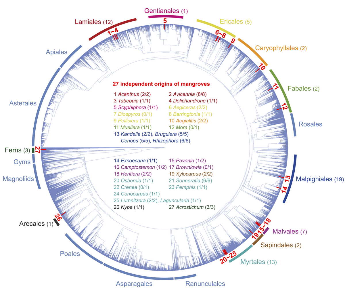 作为生长在热带亚热带海岸潮间带的木本植物类群,70余种红树植物分布在被子植物生命树的不同支系,但在生态系统中占据同一功能地位,属于同资源种团(ecological guild)。经过千百万年进化,红树植物逐步适应高盐、潮汐、高温、缺氧等一系列极端环境,在防风固沙、侵蚀防治等方面发挥了重要的生态功能,被誉为海岸卫士。由于其特殊的生长环境和地理分布,红树植物容易受到全球气候变化,尤其是海平面变化的影响。因此,它们是开展生态与进化研究的理想对象。
