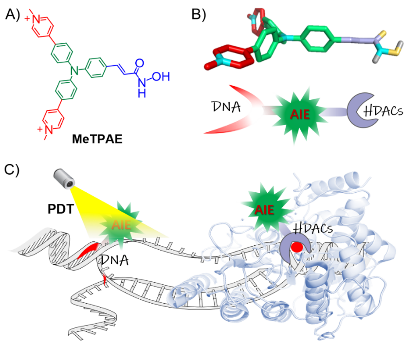 图注:A: MeTPAE的化学结构。B和C:MeTPAE 对核酸和组蛋白去乙酰酶(HDACs)的双重作用示意图。MeTPAE进入细胞核后,不仅可以与HDACs相互作用抑制细胞增殖,还可以通过PDT精确地破坏端粒和核酸。