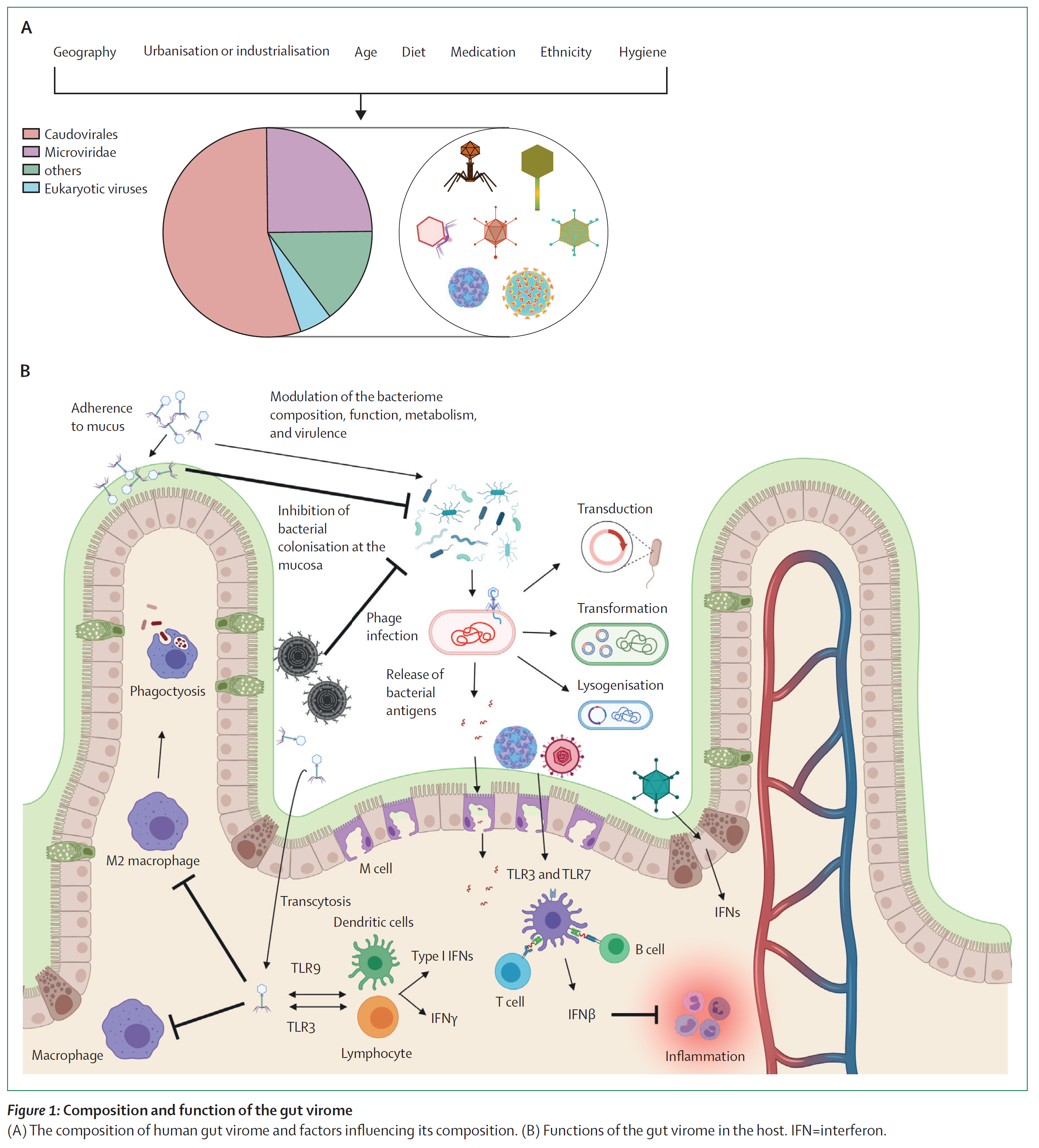 图1:肠道病毒群的组成和功能 (A)人类肠道病毒群的组成和影响因子 (B)肠道病毒群在宿主中的功能