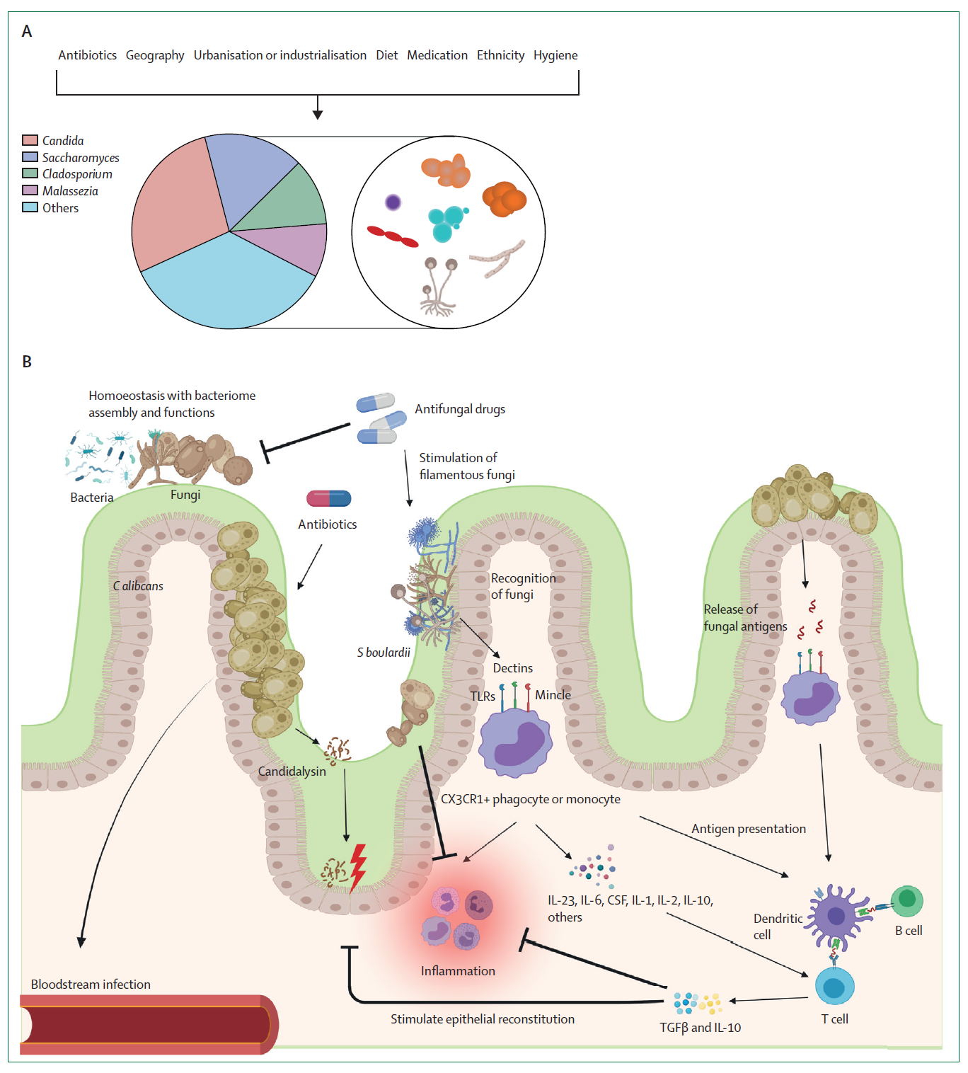 图2 肠道真菌群的组成和功能 (A)人类肠道真菌群的组成和影响因子 (B)肠道真菌群在宿主中的功能