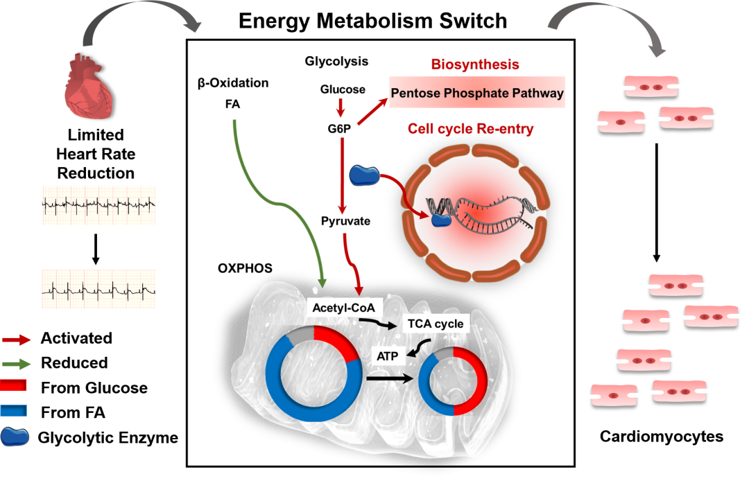 图注:适度心率降低刺激代谢模式转换,诱导心肌细胞(CM)增殖,并促进心肌损伤后的心脏再生修复
