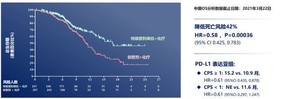 研究结果显示,与安慰剂联合化疗组相比,特瑞普利单抗联合化疗显著延长了无进展生存期,使疾病进展或死亡风险降低了42%(HR 0.58,P<0 .0001),27.8%的患者在1年内未发生疾病进展或死亡(安慰剂组仅为6.1%)。更为重要的是,总生存期的期中分析即取得了阳性结果:与安慰剂联合化疗组相比,特瑞普利单抗联合化疗可显著延长患者的总生存期(中位生存期 17.0个月 vs 11.0个月),刷新了晚期食管鳞癌一线治疗的生存期纪录;死亡风险显著降低42%(hr 0.58, p="0.0004),1年生存率也明显提高(66.0%" vs 43.7%)。