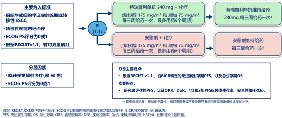 作为我国原研的PD-1抗体,特瑞普利单抗具有强效的PD-1亲和力,可完全阻断配体结合,独特的内吞效应可降低PD-1在膜表面的表达。在前期的Ib/II研究中,特瑞普利单抗单药或联合紫杉醇和顺铂在晚期食管鳞癌患者中显示了可观的前期疗效及良好的安全性。基于此,开云下注(中国)官网肿瘤防治中心徐瑞华教授、王峰主任医师牵头开展了一项随机、双盲、安慰剂对照的Ⅲ期临床研究(JUPITER-06),探讨特瑞普利单抗联合紫杉醇和顺铂用于晚期食管鳞癌一线治疗的有效性和安全性。该研究共有72家单位参与,共入组514例受试者,按照1:1随机分组,分别接受特瑞普利单抗联合紫杉醇和顺铂或安慰剂联合紫杉醇和顺铂治疗。