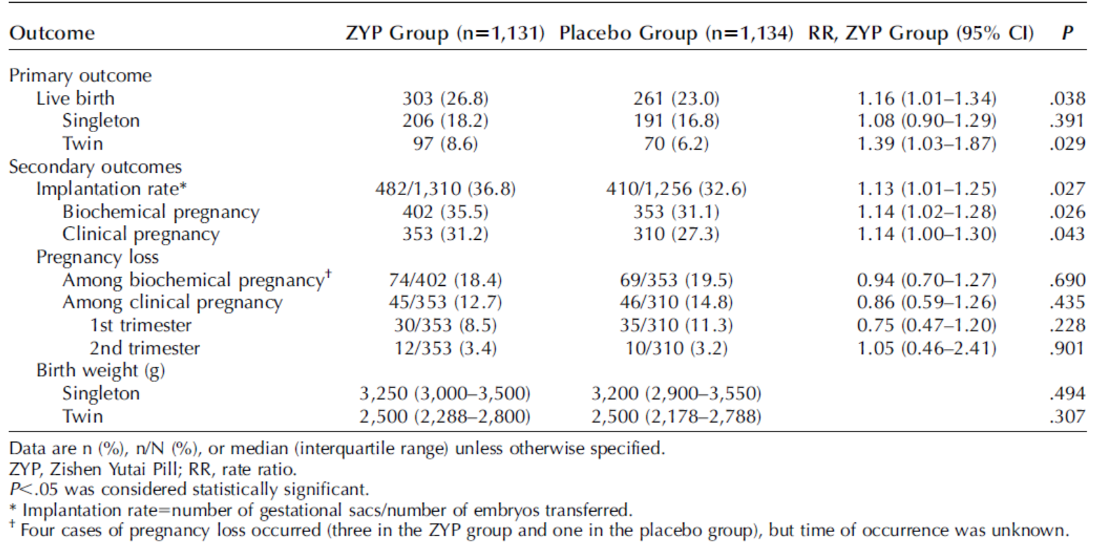 该研究由全国19个生殖中心(华南9个,华东4个,西部1个,华北5个)参与,共招募2265名接受IVF/ICSI的不孕患者,按1∶1比例随机分为滋肾育胎丸组(1131名受试者)和安慰剂组(1134名受试者)。
