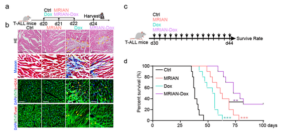 图2. MARIN-Dox降低心脏毒性显著延长T-ALL小鼠的生存率