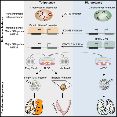 研究团队首先通过转录组和表观组学的整合分析证实,2CLC与小鼠二细胞胚胎差别明显,仍然保留着更多的小鼠胚胎干细胞特征,特别是着丝粒周边异染色质(pericentromeric heterochromatin, PCH)和非典型宽H3K4me3结构域并没有完全重塑成小鼠二细胞胚胎中的状态。不完全的染色质重塑抑制了次要合子基因组激活(minor zygotic genome activation)相关基因和母源基因的表达,而这两类基因在具有全能性的受精卵和二细胞胚胎中是大量表达的。作者随后进行了小规模的化合物筛选,最终鉴定出DOT1L(H3K79甲基转移酶)和KDM5B(H3K4去甲基酶)的抑制剂可以分别重塑着丝粒周边异染色质并部分地重建卵子和二细胞胚胎特有的非典型宽H3K4me3结构域;这两种抑制剂的联用可将2CLC“重编程”成为与二细胞胚胎高度相似的状态。