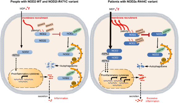 此外,该研究还筛选发现NOD2短亚型中的R444C突变(NOD2s-R444C)可以通过促进NOD2s的S-棕榈酰化以增强其稳定性,从而加剧炎症反应,但是NOD2长亚型中对应的突变(NOD2l-R471C)却对NOD2的S-棕榈酰化及介导的炎症没有影响。进一步的机制研究表明,这是由于NOD2s-R444C突变增强NOD2s与ZDHHC5的结合,而NOD2l-R471C突变并不影响二者的结合(图1)。抑制NOD2s-R444C的棕榈酰化,可消除该突变导致的过度炎症反应。由于NOD2的R471C/R444C突变在亚洲人群中频率较高,且在炎症性肠病(IBD)等自身炎症性疾病患者体内被多次发现,该研究将有助于NOD2突变相关的自身炎症性疾病患者的诊断和精确治疗。鉴于棕榈酰化对NOD2蛋白激活和稳定性的重要性,特异靶向棕榈酰化酶的药物可能是治疗自身炎症性疾病的理想靶点。