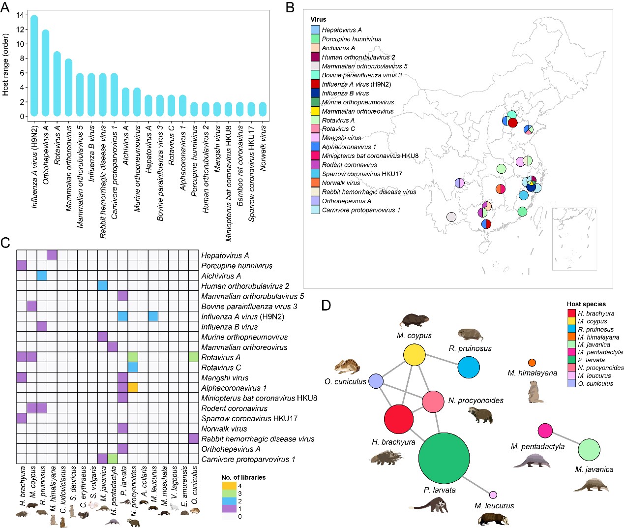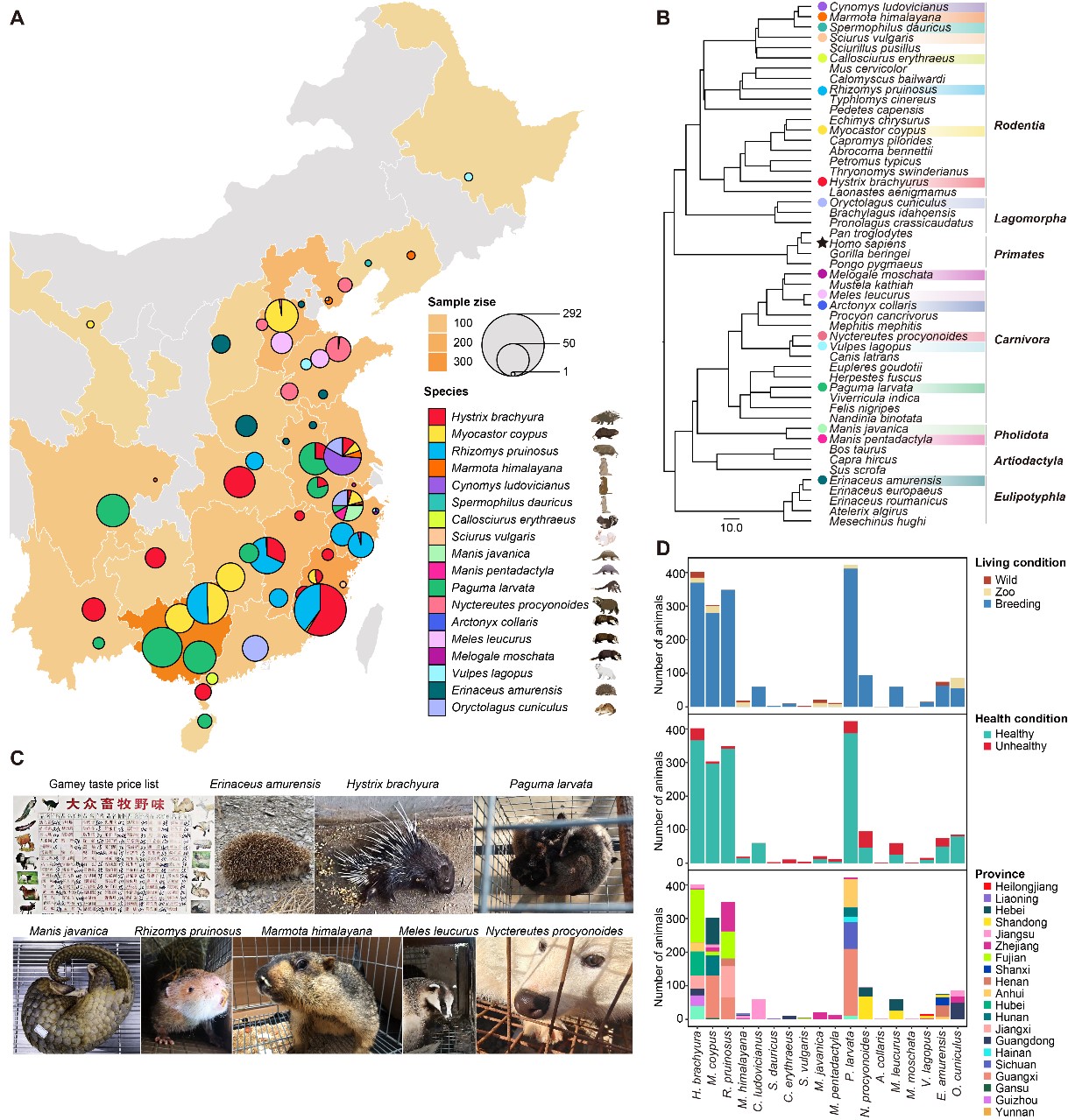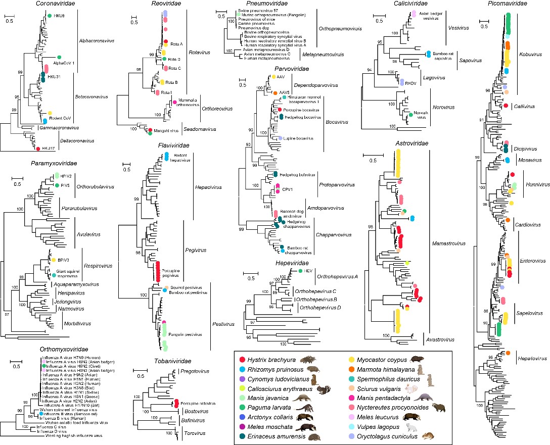 本研究采用高通量宏转录组学的方法对来自中国20个省份的1941只“野味”动物展开了大规模系统的病毒组调查。覆盖五个哺乳动物类群:啮齿目、有鳞目、食肉目、猬形目和兔形目,包括豪猪、竹鼠、土拨鼠、果子狸、貉和穿山甲等(图1)。该方法能够快速有效地揭示这些不同来源样本中已知和未知的病毒病原体,并通过生物信息学分析筛选“威胁人类健康”的病原体,大大提高了新病毒和已知病毒发现的效率。