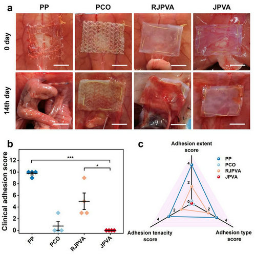 大鼠腹膜缺损修复模型中,不同处理方法(PP 网片、PCO 网片、RJPVA 水凝胶和 JPVA 水凝胶)在术后14天的内脏粘连情况,我们可以看到,PP补片触发内脏粘连形成严重,临床粘连评分可达9.8分;经典的抗粘连商用补片临床粘连评分为0.8;而JPVA水凝胶没有引起任何内脏粘连形成,临床粘连评分为0分。