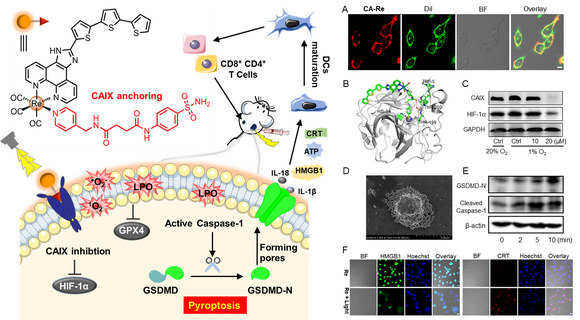 近日,开云下注(中国)官网毛宗万教授、曹乾副教授团队设计开发了碳酸酐酶IX(CAIX)靶向锚定细胞膜铼(l)光敏剂CA-Re,不仅能够在缺氧肿瘤中表现出纳摩尔级的光毒性,还能通过诱导gasdermin D(GSDMD)介导的细胞焦亡增强肿瘤细胞的免疫原性,进而在体内有效激活抗肿瘤免疫应答,最终在消灭原发肿瘤的同时消灭远端肿瘤。