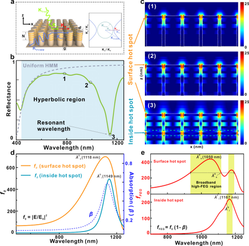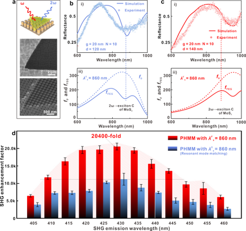 针对上述问题,他们首先在理论上提出考虑系统吸收损耗的场增强增益因子和最佳场增强增益模新概念,以实现比传统共振模式更好的光学响应增强。传统上,人们采用场增强因子f0(λ)= |E(λ)/E0(λ)|2(E(λ)和E0(λ)分别表示当波长为λ时,光子学系统中的总光场振幅和入射光场振幅)寻找共振模式(共振波长即为使f0(λ)取最大值的波长,记为λ0),作为光与物质相互作用增强的最优选择。但共振模式往往伴随最大的吸收损耗,会显著减少实际参与光与物质相互作用的光子数,从而大大降低共振模式带来的光学响应增强的实际效果。为此,他们提出场增强增益因子新概念fFEG(λ) = f0(λ)[1-β(λ)](β(λ)为光子学结构对于波长为λ的光子的吸收率),以寻找最佳场增强增益模(fFEG(λ)取最大值的波长即为最佳增益模的波长,记为λF)用于增强光与物质相互作用。理论模拟发现:不仅最佳场增强增益模比共振模式有更显著的光学响应增强,而且存在一个比共振模式更强的光学响应增强宽带区,如图1e所示。为实验证明场增强增益概念的有效性,他们通过单层MoS2与阵列双曲超结构相互作用的非线性光学响应,演示了存在一个比共振模式更强的非线性响应宽带区,且最佳场增强增益模可导致超过20000倍的二次谐波信号增强,约为相同条件共振模式所产生二次谐波增强的2倍,如图2所示。