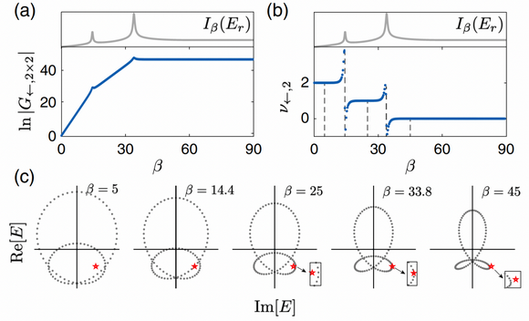 上图为非厄米系统稳态响应中的量子化平台。(a)稳态响应强度随耦合参数的变化。(b)稳态响应强度变化率出现量子化的平台。(c)对应非厄米哈密顿量的复能谱结构,其关于所选参考点的卷绕数等于(b)中平台高度。