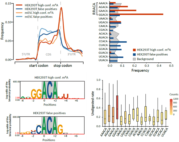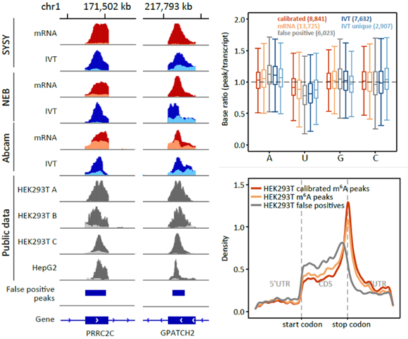 MeRIP-seq(或m6A-seq)是目前最常用的RNA修饰检测方法,被大范围的用在m6A相关研究中。该方法原理是用m6A特异性的抗体对片段化的RNA进行免疫沉淀反应,将含有m6A的片段富集出来进行测序。在研究同时对体外转录IVT RNA文库也进行MeRIP-seq,结果表明即使是对不含m6A修饰的IVT RNA文库,抗体依旧能够富集到大量RNA片段,并且这些富集的“peak”在已发表结果数据中重复出现,表明MeRIP-seq其实受到假阳性信号的严重干扰。分析IVT RNA中被富集下来的区域,发现这些区域所在的基因表达量较高且富含腺嘌呤。去除假阳性信号后,鉴定出来的修饰区域更准确(图3)。