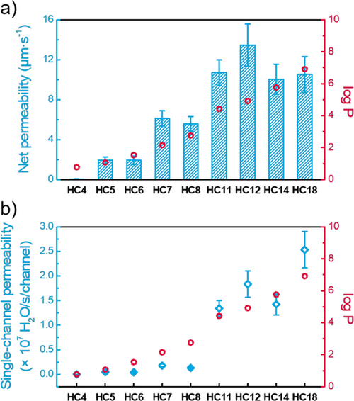 图3. HC4−HC18咪唑四聚体水通道的在细胞膜中的(a)净渗透率和(b)单通道渗透率与相应化合物的亲脂性log P值对比图。