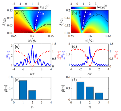 图1. 基于运动自由度的典型的两声子聚束态(左栏)和三声子聚束态(右栏)的量子统计特性。