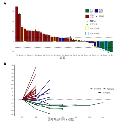 (B) 按照RECIST1.1标准个体肿瘤负荷百分比随时间纵向变化